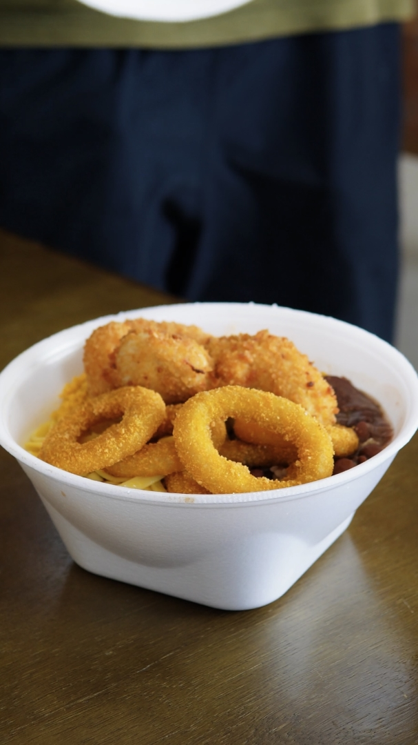 Iscas de filé bovino, frango crocante, calabresa, batata frita, pepino, ovo de codorna, aipim, cebola à milanesa, molho e pão xadrez.